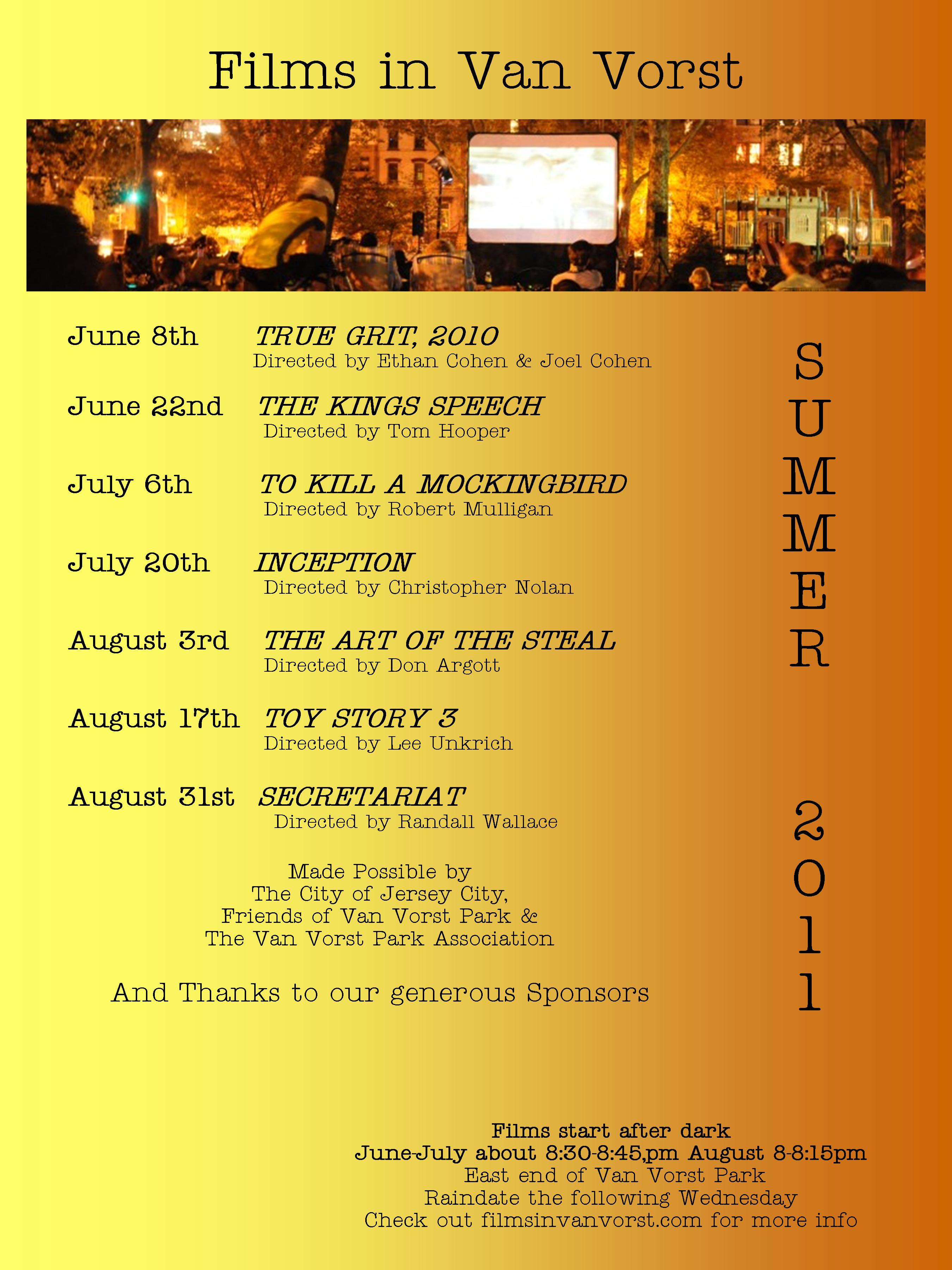 The 7th Annual Outdoor Summer film Series will again take place in Van Vorst Park on Wednesday nights. Screenings in June and July will begin at about 8:30 or later depending on sunset. August and September screenings will begin at 8:00 pm. The rain date for each film will be the following Wednesday.
